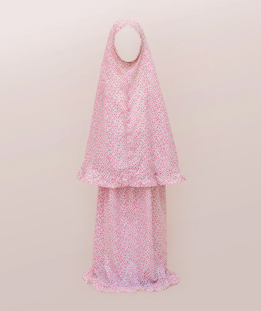 Peach Kids Corniche Prayer Cover introduces your little one to the beauty of prayer with a thoughtfully designed two-piece set that provides both comfort and coverage. This lovely ensemble creates a peaceful and cherished prayer experience. Crafted from a soft, breathable cotton blend, the Peach Kids Corniche Prayer Cover feels gentle against the skin and allows for easy movement, ensuring she stays comfortable and focused. The delicate red floral print adds a touch of sweetness and grace to this modest garment.