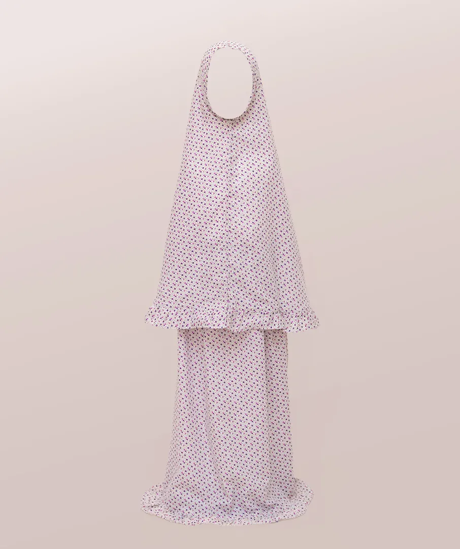 This lovely two-piece set is adorned with a delicate purple floral pattern, bringing a sense of gentle beauty to her spiritual moments. Crafted from a soft and breathable blend of 65% cotton and 35% polyester, the fabric ensures she remains comfortable and at ease, allowing for peaceful focus during prayer. The thoughtful two-piece design provides ample coverage while still allowing easy movement, making it simple for her to wear.